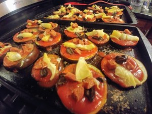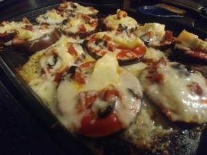 Today’s recipe for Eggplant Pizzas is from Clean Eating Magazine and you click right through to see it. It’s relatively simple to make and it’s definitely a healthier option than regular pizza. It’s also not expensive to make, making it budget-friendly. As with any kind of pizza recipe, this one allows you to tailor your pizzas to how you like them so if you don’t like pepperoni or roasted red peppers, you can skip them. It’s easy to switch up the ingredients as you wish. I like artichoke hearts, pepperoni, olives and roasted red peppers on mine.