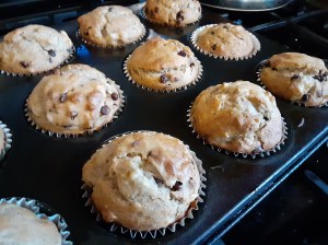 In my search, I stumbled across a new blog, The First Year Blog, and their Bakery Style Banana Bread Muffin recipe. I had all of the ingredients including the right number of frozen bananas, I didn’t need to do a ton of ingredient conversions to make it fit our needs, and I decided to make them and not mention the name of them. I wondered if they really would taste any different than other banana chocolate chip muffin recipes I’ve tried before.