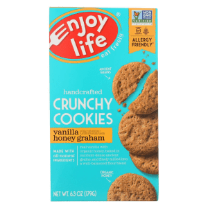 I searched online for a typical cheesecake tarts recipe to see what I was up against. The first one I found from Taste of Home called for vanilla wafers as a crust. I remembered that at the allergy-friendly bakery we go to often, they told me that they used Snickerdoodle cookies for their cheesecake crusts and that I’d done a raspberry swirl cheesecake last April for Easter and done just that, with great success. I decided to get some allergy-friendly vanilla wafers and follow the recipe. However, when I stopped at the store late last week, they didn’t have gf/df vanilla wafers, but I spotted a new flavor cookie I hadn’t seen before from one of my favorite brands, Enjoy Life. It was a crispy cookie, Vanilla Honey Graham, and it sounded like it could work. Since they were priced two for something, I bought four boxes, two to crush up and two to have on hand to eat later on.