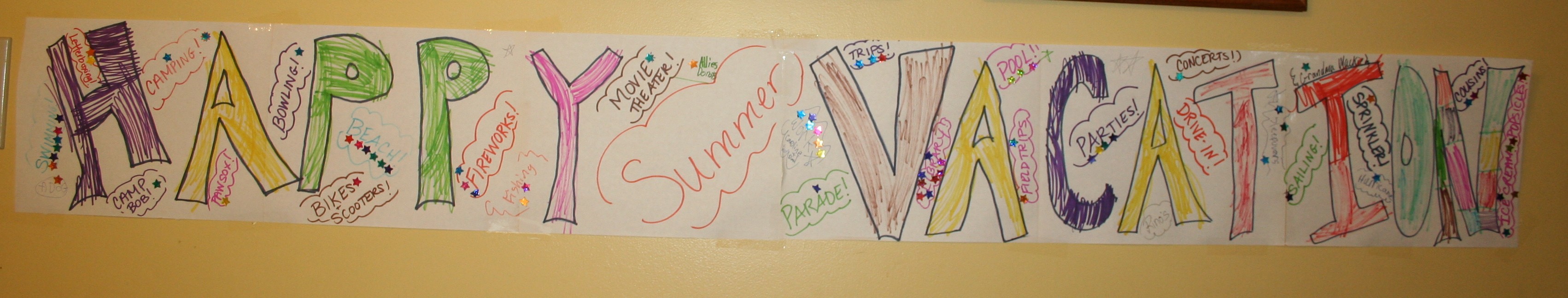 At first I just wrote out Happy Summer Vacation and left it at that. Then I decided that she and I would think of all the things we like to do over the summer and I’d write them all over the banner to fill it up a bit more. So that’s what we did and it was a nice way to spend the afternoon together.