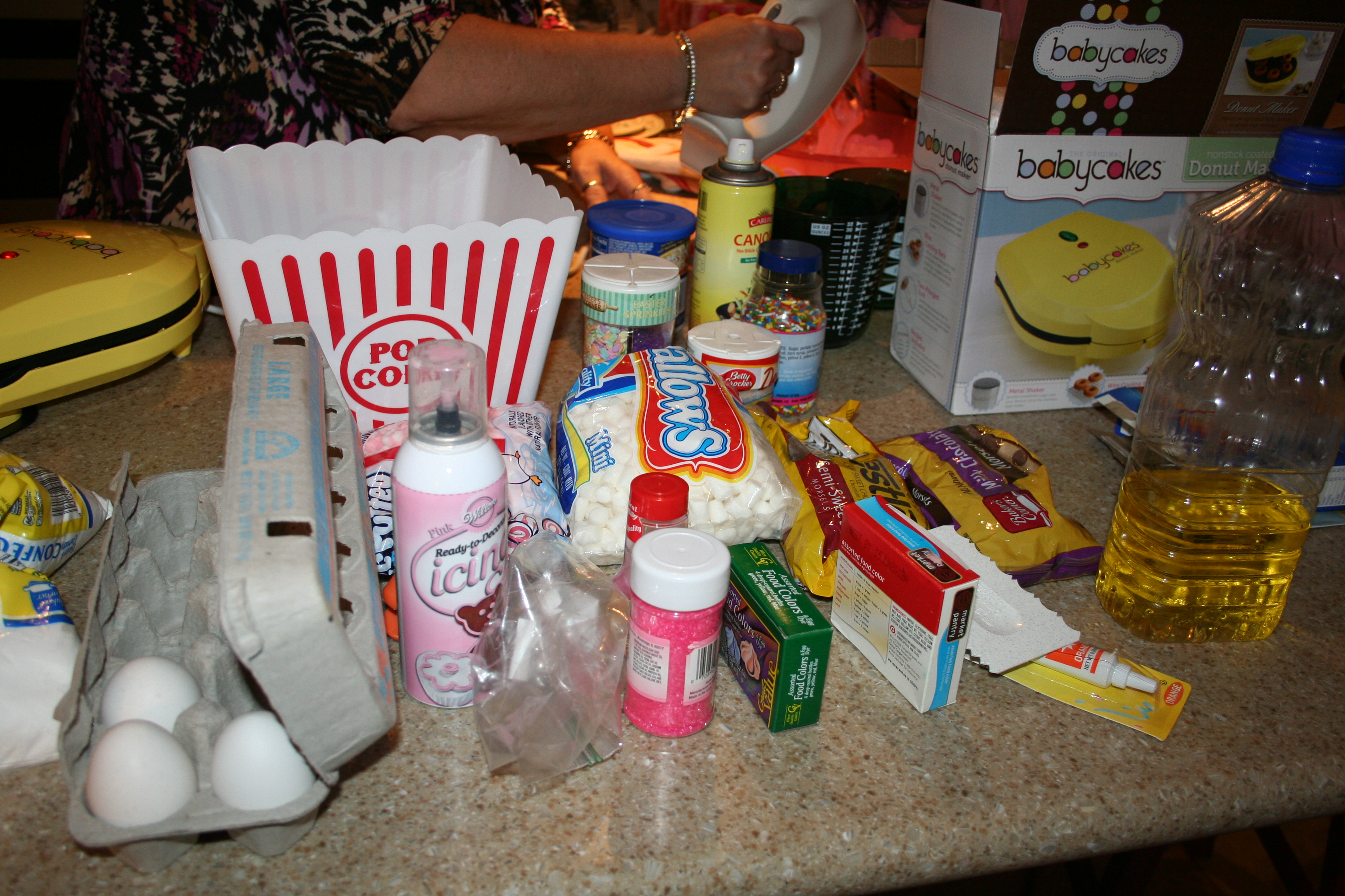 The two teams were each given their cake mix and a vanilla frosting, all the mixing bowls and measuring cups they needed, a Babycakes Donut Maker, and a counter full of Common Ingredients that they could use for their decorating no matter what team they were on. We set one team up on the island and one team up at the kitchen table with the Common Ingredients between them on the end of the island.