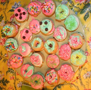 The judges were each given an index card with the team’s name on top. Each team had picked three donuts or sets of donuts to showcase for the judges. The judges had to go to each team and critique the donuts on taste, creativity, presentation and then give and overall score (just like that show we watch, Four Weddings, on TLC!) Jess and I had prizes for both teams as well as for both captains, so no matter what it would all work out. (We love our respective Dollar Tree dollar stores for things like that!)