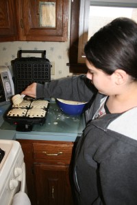 The waffle iron gets hot, so younger kids can't help out with dropping the batter onto the squares, but older kids can. Plenty of mixing and measuring for the younger kids to do though.