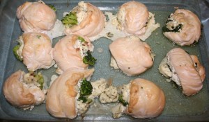 The official name of it is Chicken Asparagus Bundles, but we have made them with either asparagus or broccoli or spinach and all have been great. It’s a fast recipe and when I made it last week after not having made it for a long, long time, it got five thumbs up here; a minor miracle. Even Alex, my meat-hater-since-birth, loved it. We served it with couscous that night, and a Caesar Salad on the side. On that particular night I split the bundles so that half contained broccoli and half contained spinach. Normally when we buy our frozen broccoli we buy Broccoli Florets. On one of our trips recently we accidentally bought Broccoli Cuts, which I hate because it’s almost all stems and very few florets (despite the package picture). This recipe was perfect for the cuts because I picked out all the florets to stuff half of the chicken bundles with, threw out all the stems, and then used frozen cut spinach for the rest of the chicken.