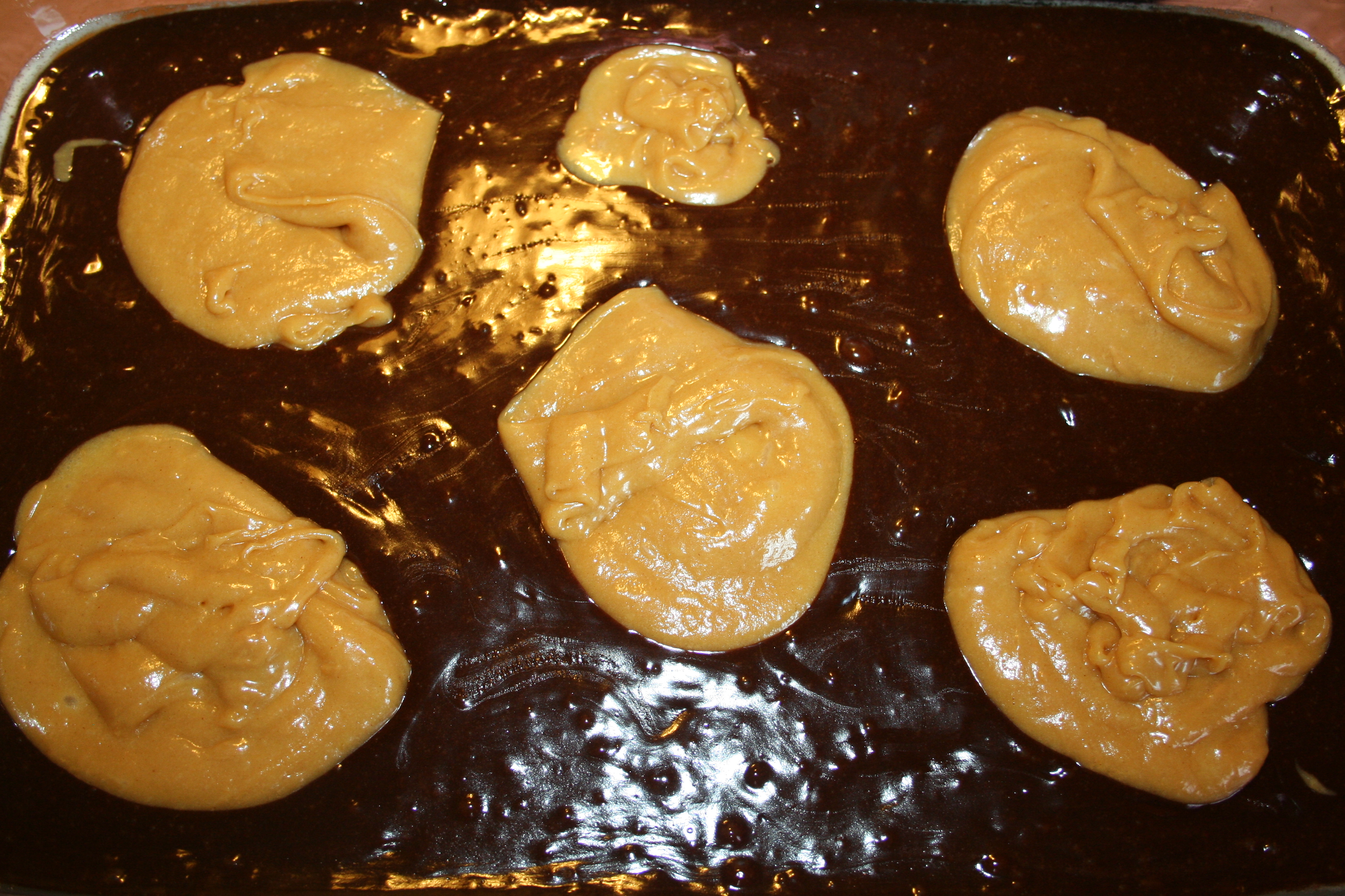 Spoon peanut butter batter over and swirl with a knife until proportionate.