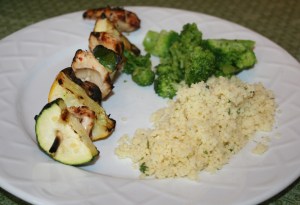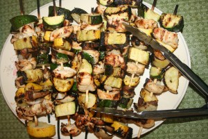 For last week’s kabobs we kept it simple, marinating the chicken for a few hours in bottled Italian dressing and then loading zucchini, yellow squash, onions and mushrooms onto the skewers along with the chicken.