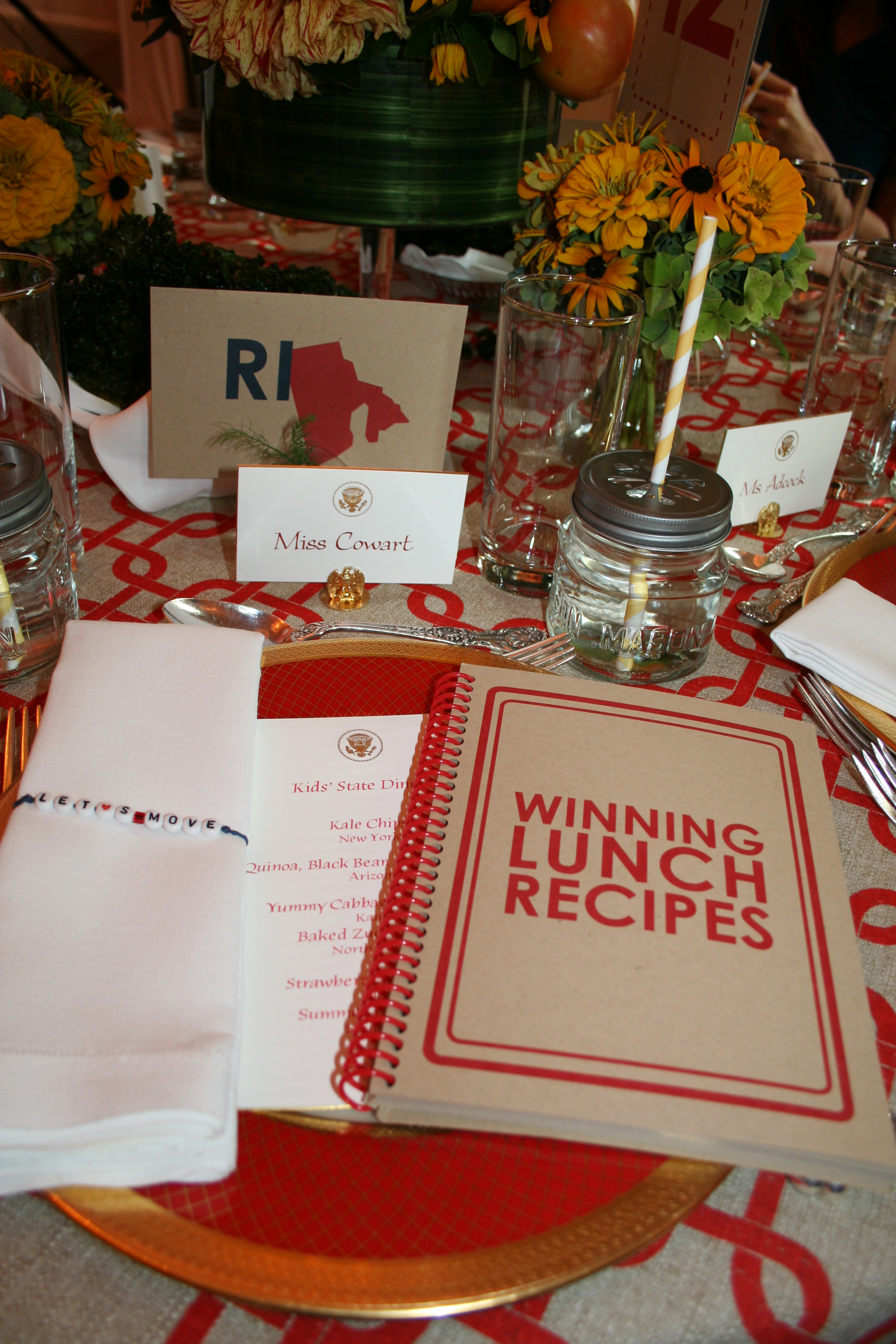 The little added touches made all the difference: pretty centerpieces made of fruits and flowers, a map with our state on it in front of our spot, a “Let’s Move” bracelet as our napkin ring around our white linen napkins.