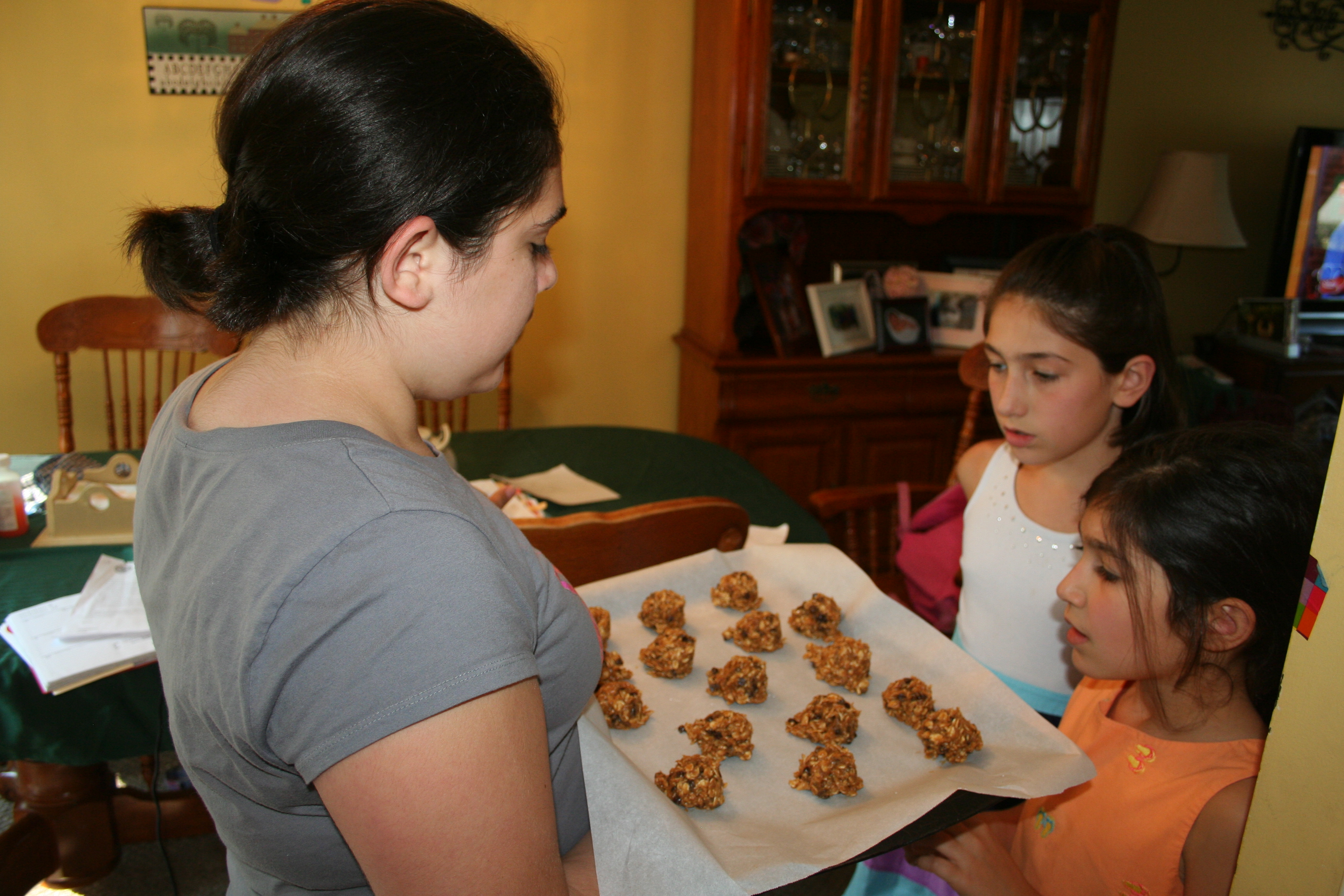 With our new school schedule for Caroline, she’s home an hour before the other two girls, so she’s been excited to help plan or make the snack for them. Last week she got a kick out of serving it to them when they got home. We took a recipe for Peanut Butter Oatmeal Butterscotch Balls (no bake, no eggs) from Pinterest and instead of Butterscotch Chips, which we didn’t have, we used mini chocolate chips, which I like better anyway. They were a hit. All five of us liked them and they were quick and easy.
