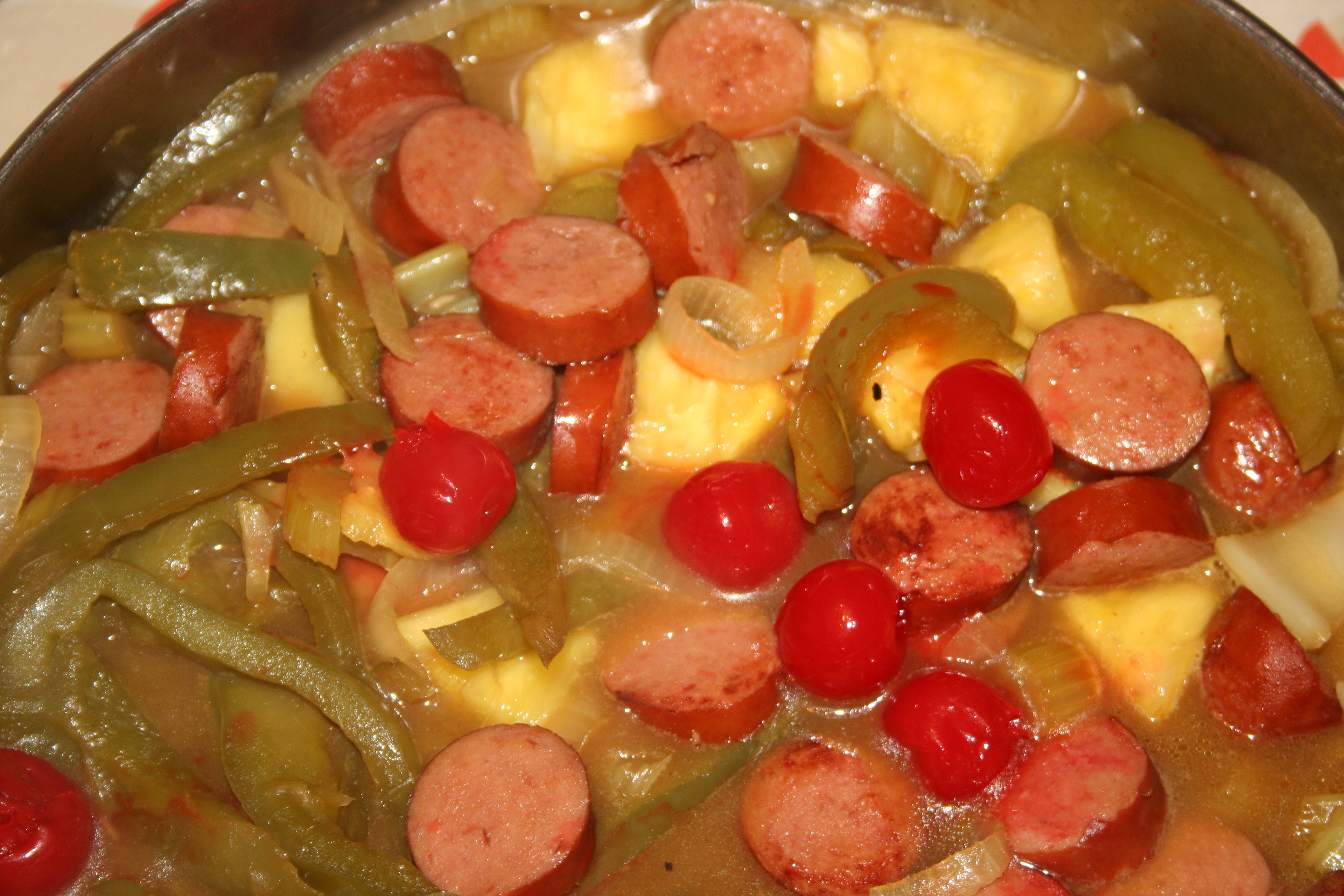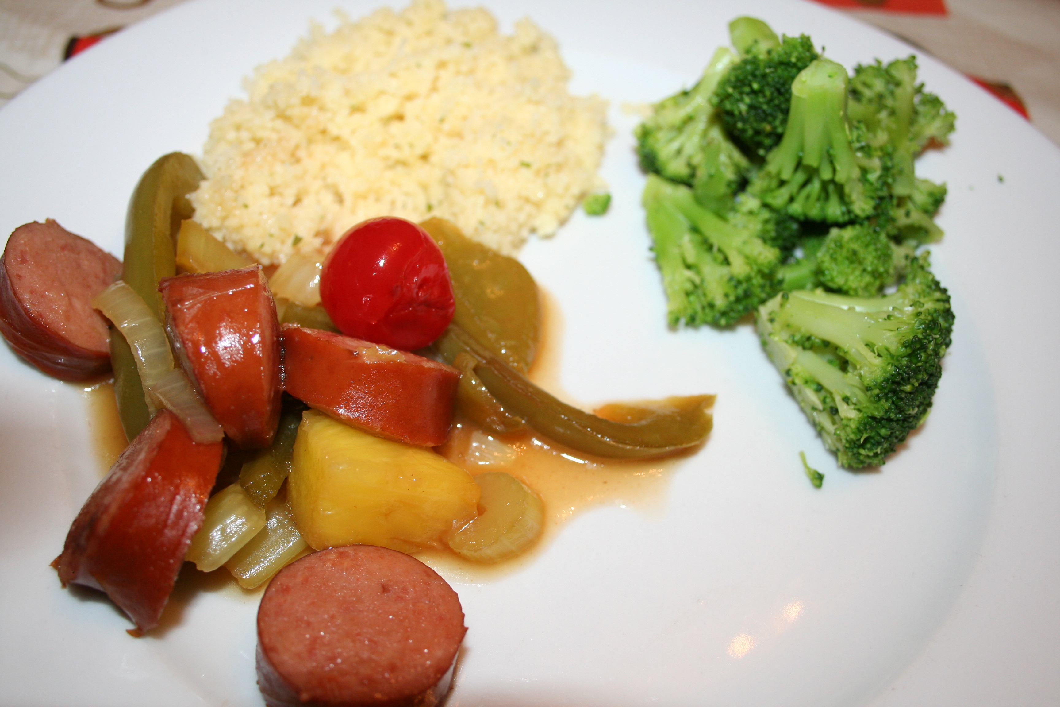 Recently Don found a recipe for a lowfat sweet and sour sauce for chicken, on food.com, and he used it to make the kielbasa. It was delicious. We served it with a lowfat couscous and a side of broccoli. Everyone loved it, we’d make it again, and I’d make it for chicken too!