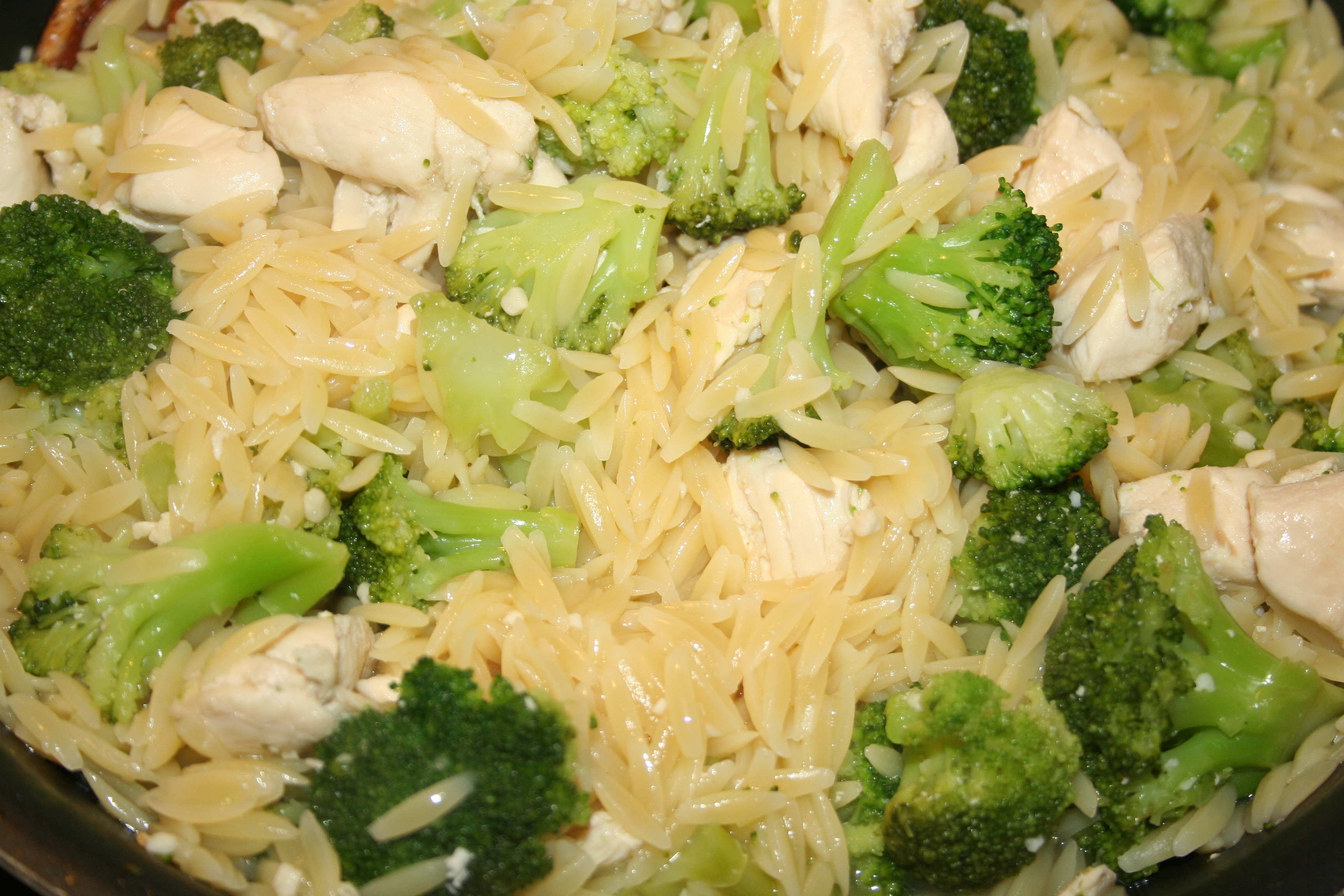 Once the orzo, broccoli and chicken were each done, I put them all into the one frying pan that held the chicken, together, and cooked a few minutes, adding more chicken broth, until it was to my liking.
