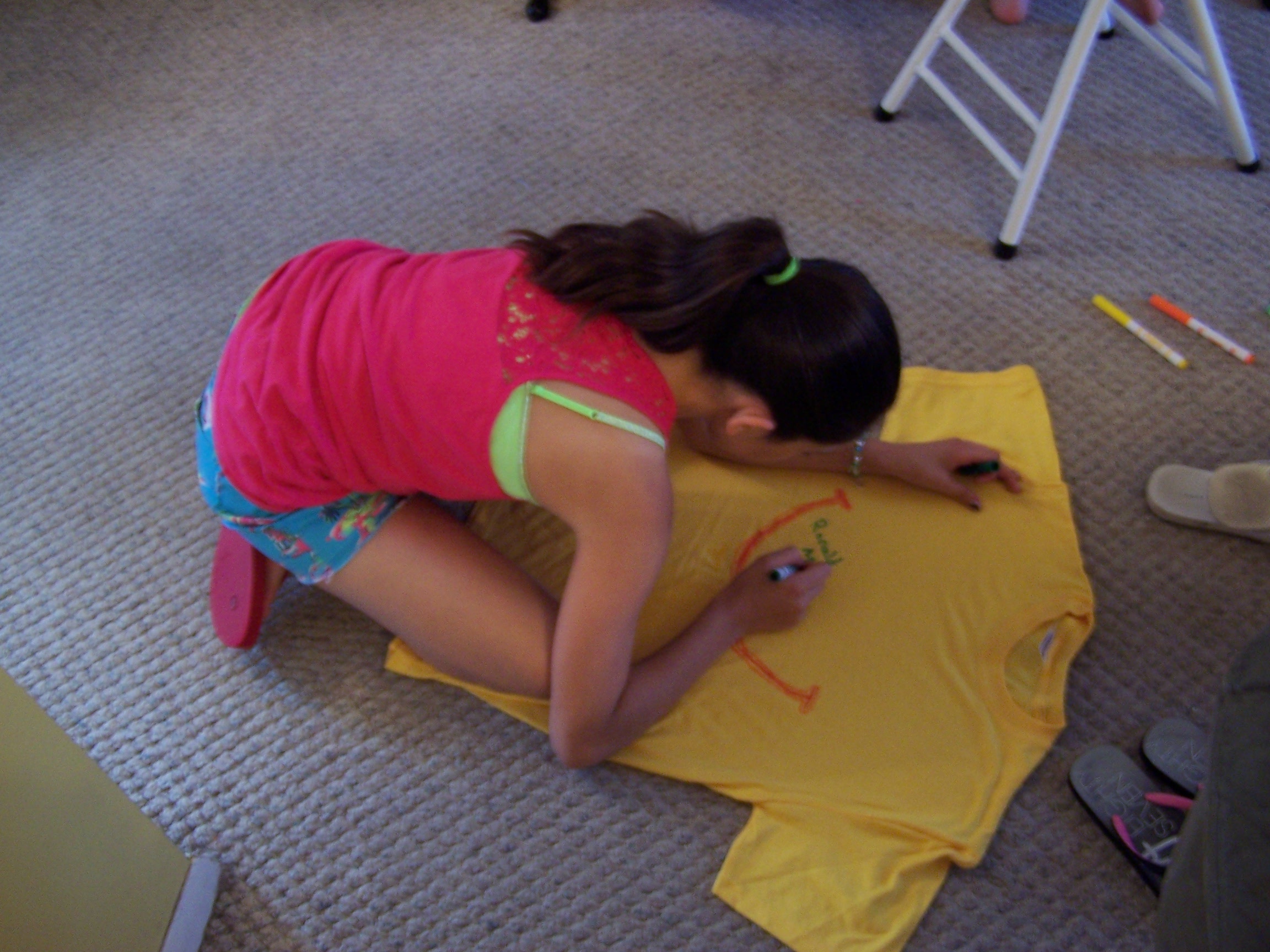 The night of the party arrived. All of the guests brought bags of donations for Ronald McDonald House. We had coloring books, puzzle books, toiletries and grocery items. We filled a whole basket with them. The girls decorated their t-shirts any way they wanted to. Our three decided to make theirs Ronald McDonald themed, with big red smiles. Caroline, who loves doing nails, did all the girls’ nails in yellow with big red smiles on the thumbs. So cute!
