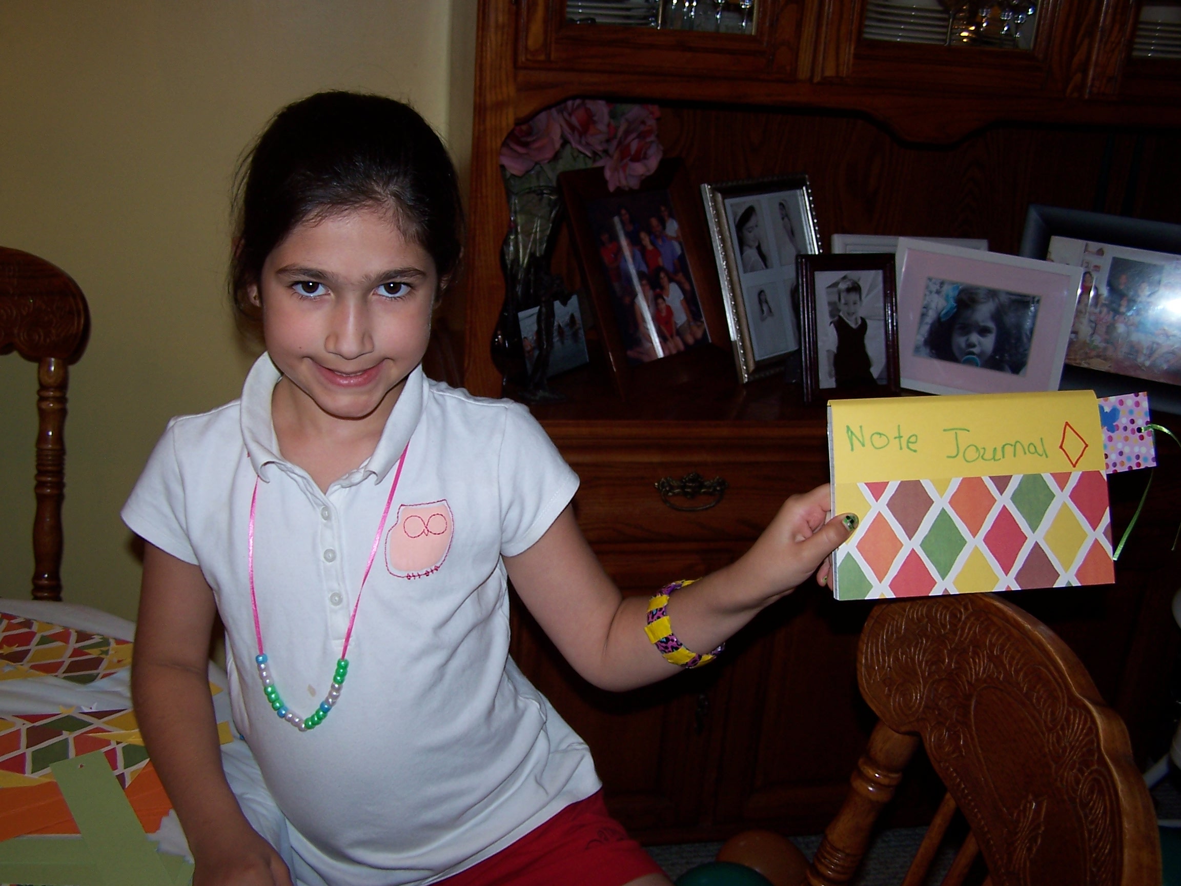 And then came the real fun. Elizabeth had found plates, napkins and streamers in the colors of red, orange and yellow at the dollar store. While we were there, we happened to find bright yellow t-shirts that we could decorate with the fabric markers we had at home; a great activity for the party. We decided to make covered journals and coordinating bookmarks as the craft. We’d use composition notebooks and scrapbook paper to cover them. The bookmarks would be made with the leftover scrapbook paper. These would be for the girls at the party and for the Ronald McDonald House; each guest would make one to keep and one to donate. The journals could either be for kids or adults. They could be used as diaries or for keeping notes at doctor visits or even as gratitude journals.