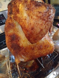 We cooked our chicken in the oven until the temperature reached or exceeded 165 degrees, about an hour and a half. We opted to add baked potatoes to the stands which were included with the product and we were thrilled that there was absolutely no mess in our oven. We had placed the whole thing on a baking sheet covered in tin foil, just in case, but the tray included in the box contained any slight dripping that may have occurred.