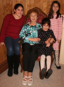 This is Grandma Grello with our girls, three out of I think 15? great grandchildren, this past July which is shortly after she turned 91 in May.