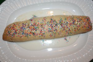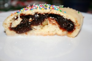 Combine flour, baking powder and salt in a large bowl and set aside.  In another bowl, combine sugar and shortening and beat with mixer until smooth.  Add milk and vanilla.  Add eggs one at a time.  Add this mixture to dry ingredients and mix together by hand with a large spoon.  Once incorporated (and with lightweight “kitchen-type” gloves, if possible), finish mixing with your hands until it comes together into a smooth dough.  Transfer to a floured surface, and use a knife to cut dough into six pieces.  Roll each piece out into a long strip (approximately 13-14” long and about 7” wide), one at a time, and fill center of strip with a portion of the prune filling.  Fold each side over the middle and fold the ends under.  Place filled strip on parchment-lined cookie sheet (two strips per sheet) with seam side down.