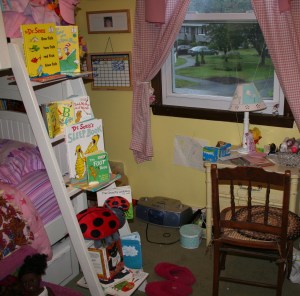 On rainy days my kids have been known to set up a "library" in their rooms. This photo shows the "children's section" of their "library," complete with a check out desk.