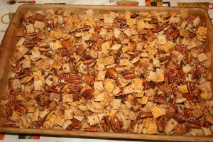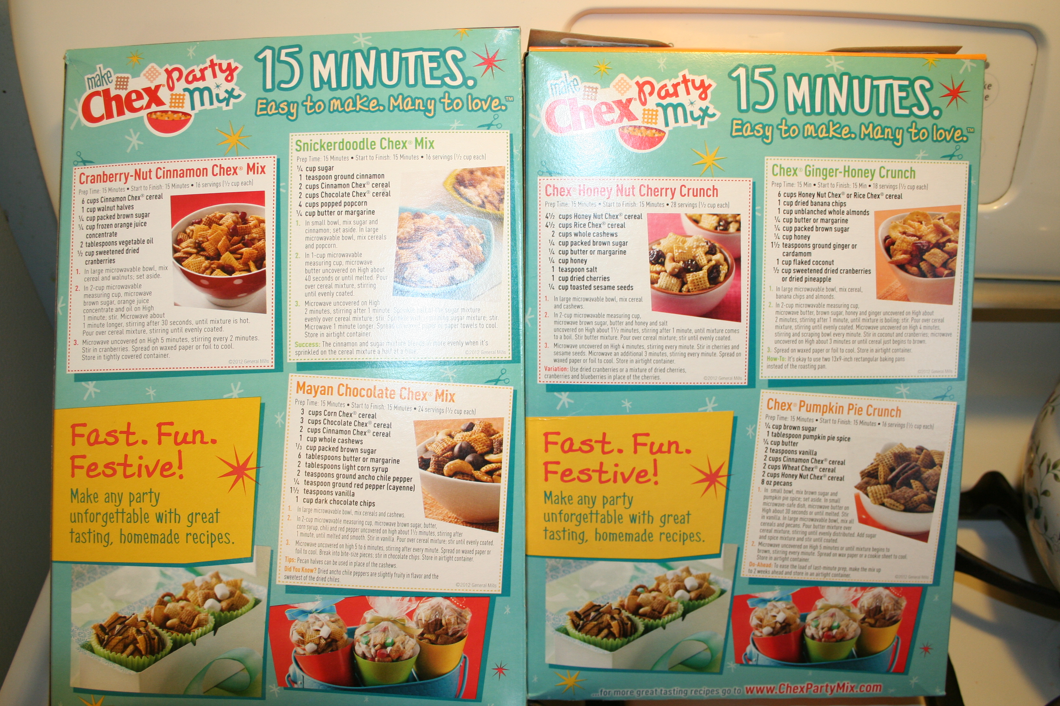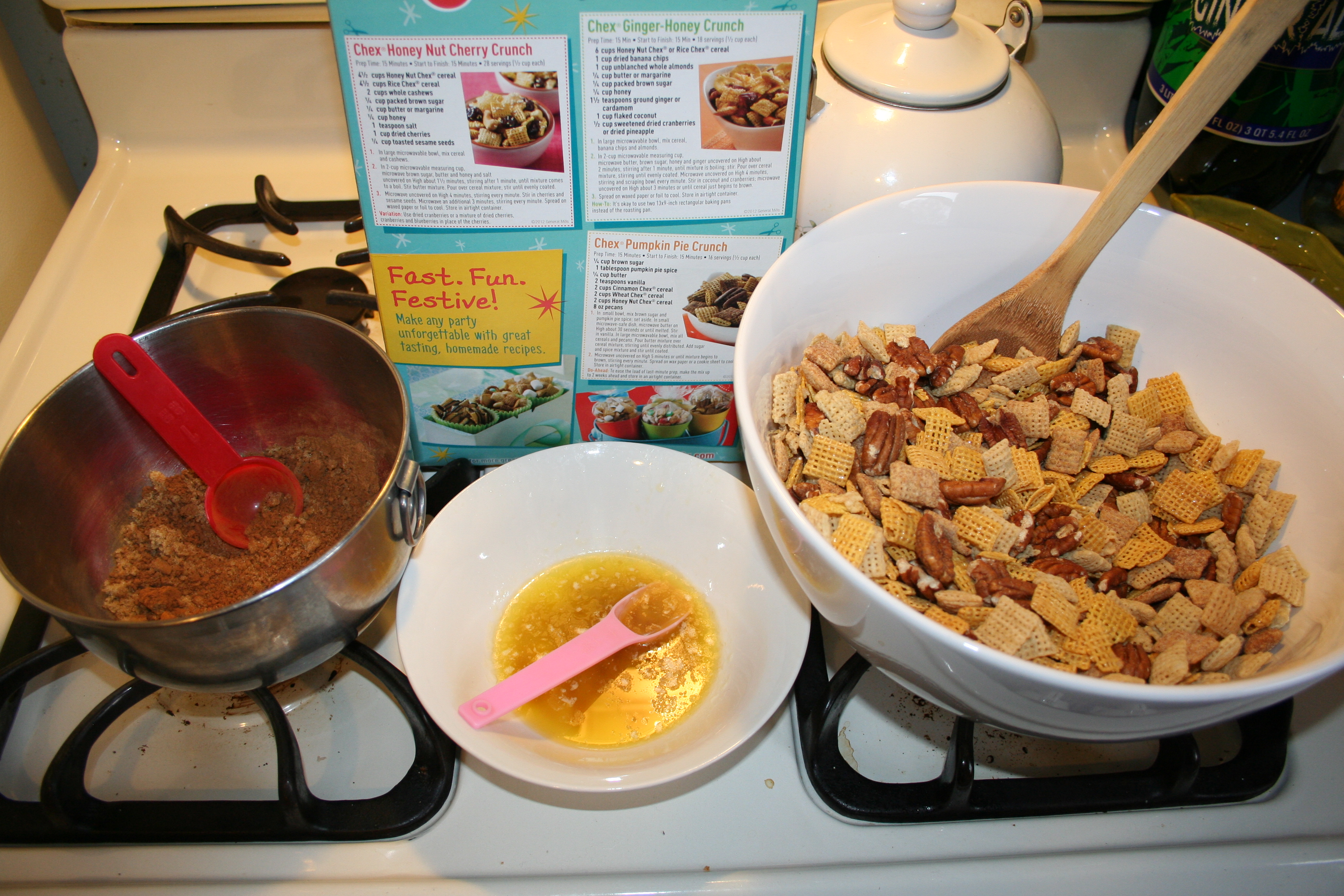 Most recently, Elizabeth stumbled on the jackpot: a Chex cereal box with three recipes on the back of the box. She found one she wanted me to try, and it had a seasonal flavor to it, just in time for Thanksgiving. One Monday afternoon I decided to give it a try because I had everything I needed on hand with the exception of one type of Chex cereal. It called for three different kinds and I had three, just not the exact three. You’ll see what I mean in my notes below.