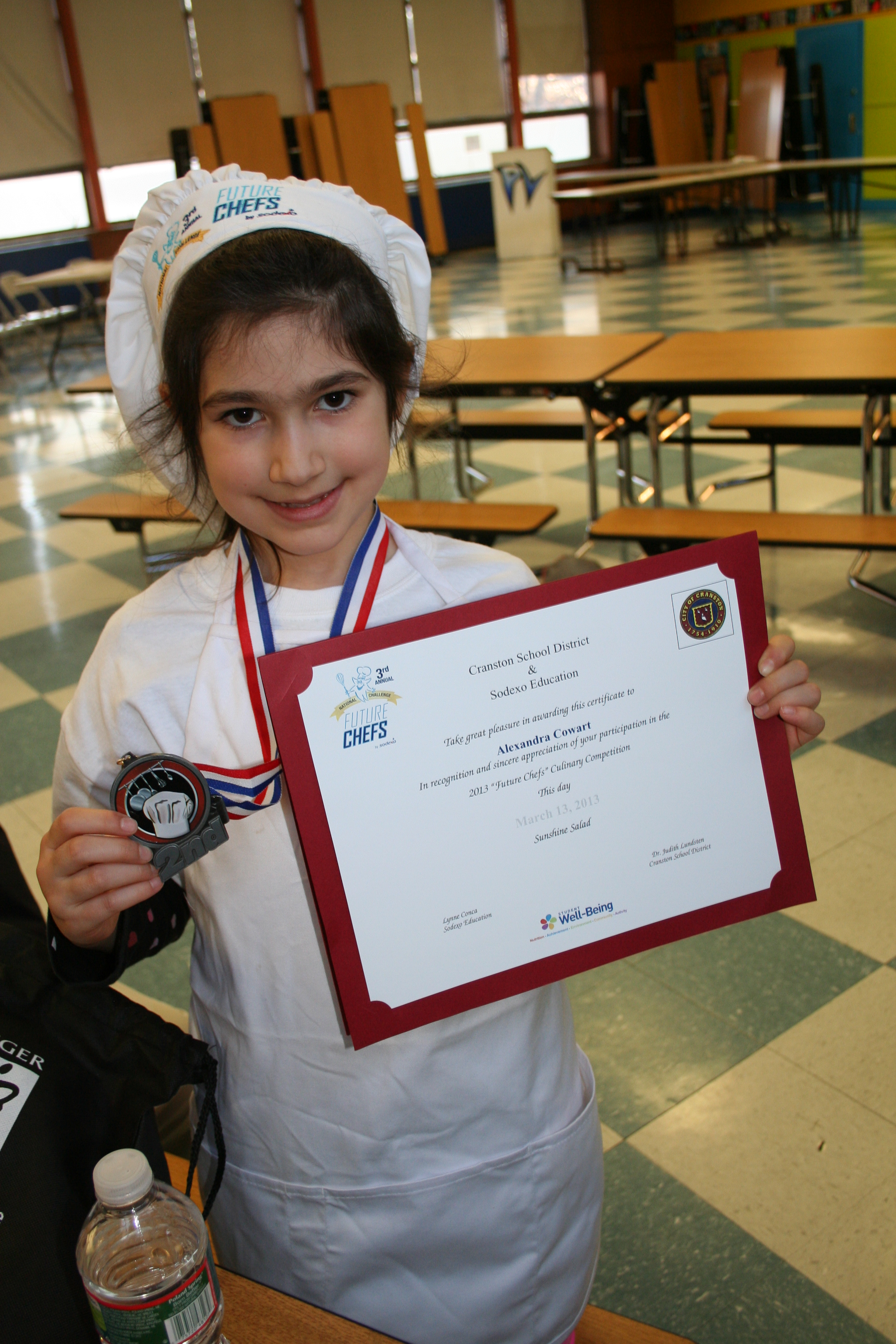 On Wednesday night, Alexandra competed in a cooking contest of her own. She had entered the recipe for her Sunshine Salad into the Sodexo Future Chefs competition in our city. Out of 17 elementary schools, ten students were chosen to compete, making their salads and having them judged by real chefs from our community.