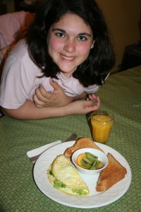 Caroline and I came up with an egg white omelette with broccoli and mozzarella cheese because she will only eat egg whites, and she loves broccoli. On the side we had wheat toast and mixed fruit (kiwi and nectarines).