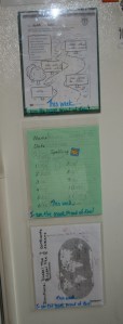 As the postcard mail began to trickle down and we had just a few states left, I took the whole lot of them to our local learning store, Lakeshore Learning Store, to be laminated. We also laminated some maps that she wanted in her room as well. We had a Rhode Island map which has hung in our basement for years, that she wanted on her wall. She particularly likes the fact that it has the dates 2006-2007 on it and she points it out to whoever comes into the room. We had a world map in one of the kids’ rooms that was not being used, and I ordered a special US map from the Highlights Magazine “Which Way USA” club, that we had now enrolled her in. The laminated postcards stretched from our sliding glass door in our dining room to the coffee table in our living room, about 14 feet in length and about two feet across.