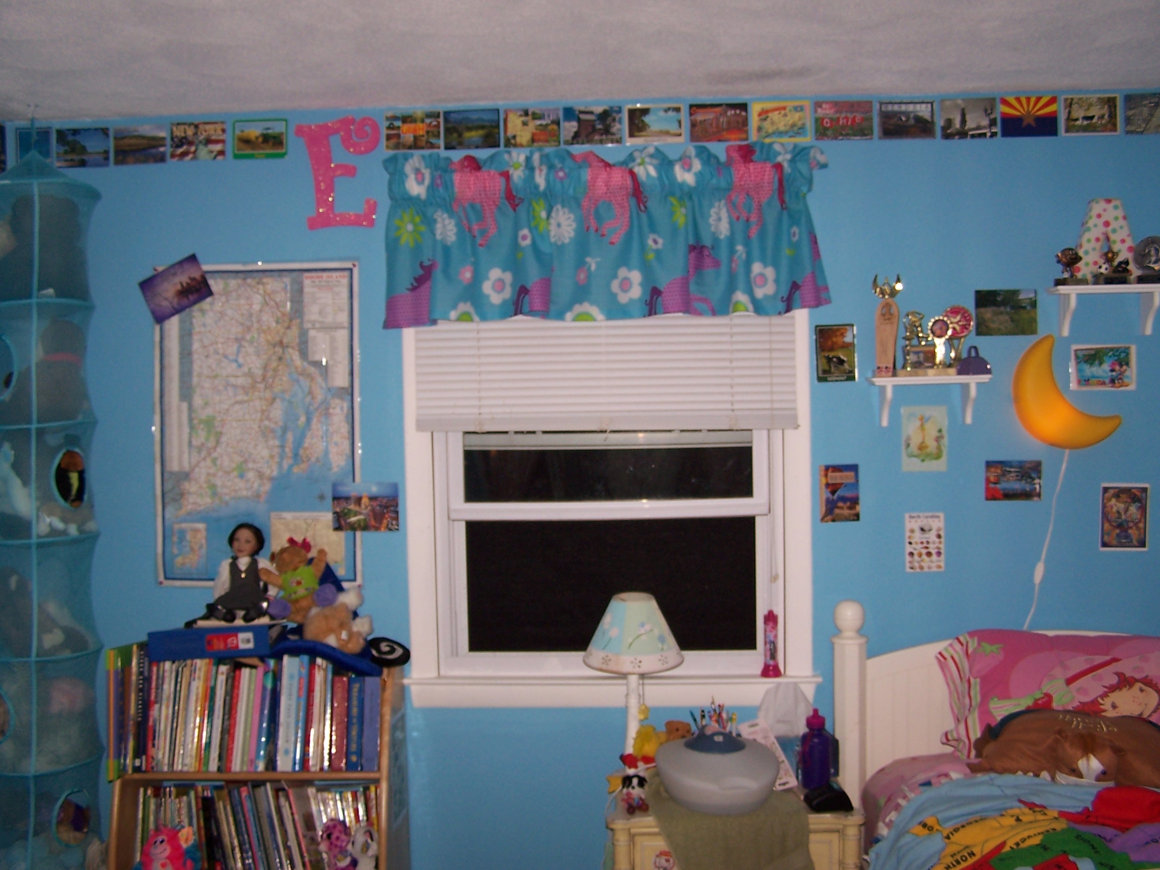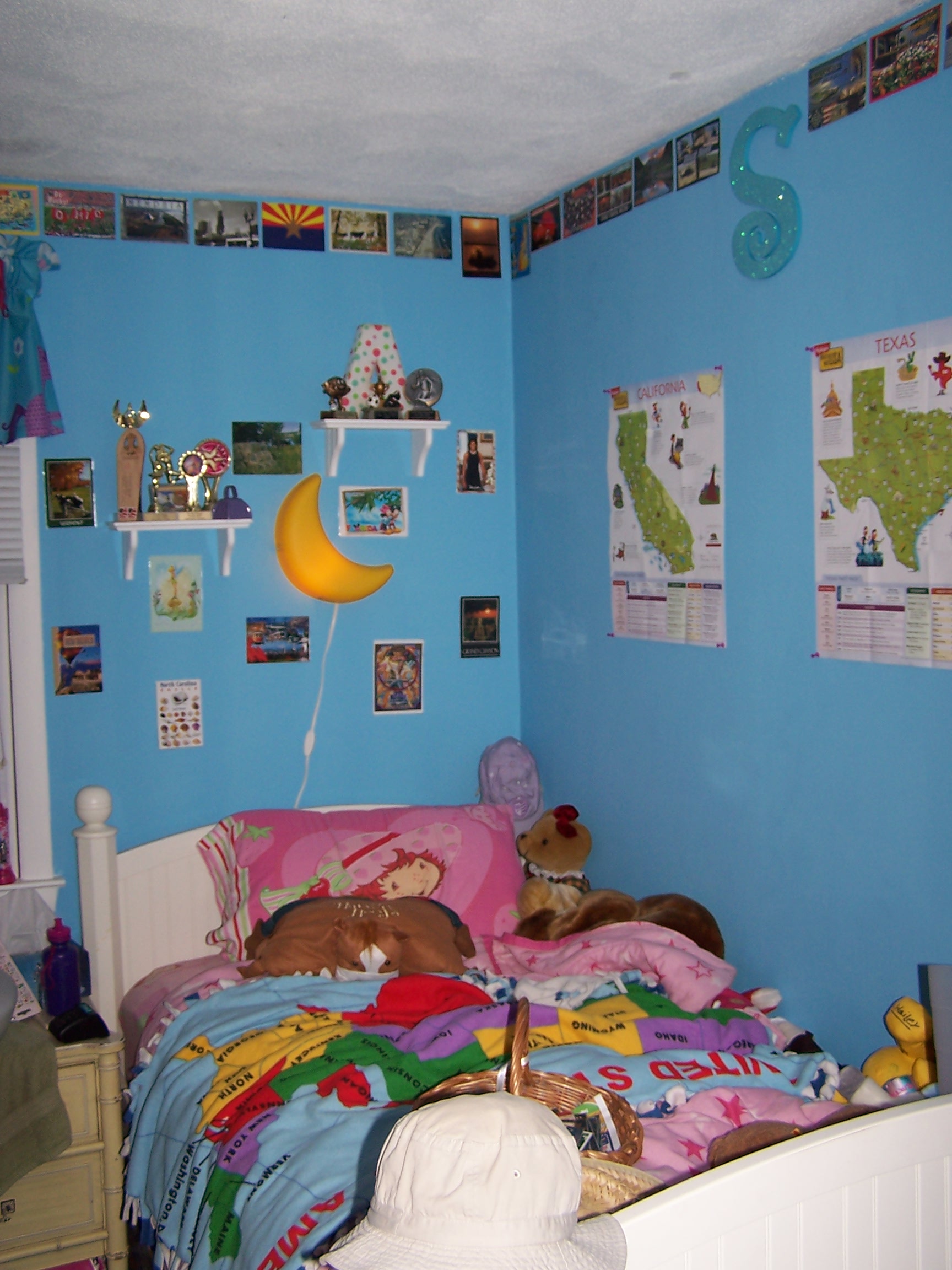 I went to Hobby Lobby one afternoon and found huge letters that were on sale for half off: N, S, E, W in pink and blue sparkly colors and Don put them up on her walls, using a compass so that they were really placed accurately pointing North, South, East and West. I found a cool project in FamilyFun Magazine while sitting in the doctor’s waiting room one day, and I had to replicate it on her wall. I knew the perfect spot. Alex noticed a blanket in the trunk my car that I’d made for the kids years ago, a 50 States blanket with a map of the country on it. We washed it and brought it up to her room and placed it at the bottom of her bed, which was still awaiting a back-ordered, horse-themed “bed in a bag” set. She found a globe at the book store, and used some gift money to purchase it. The room was coming together in our minds, and on the walls, piece by piece.