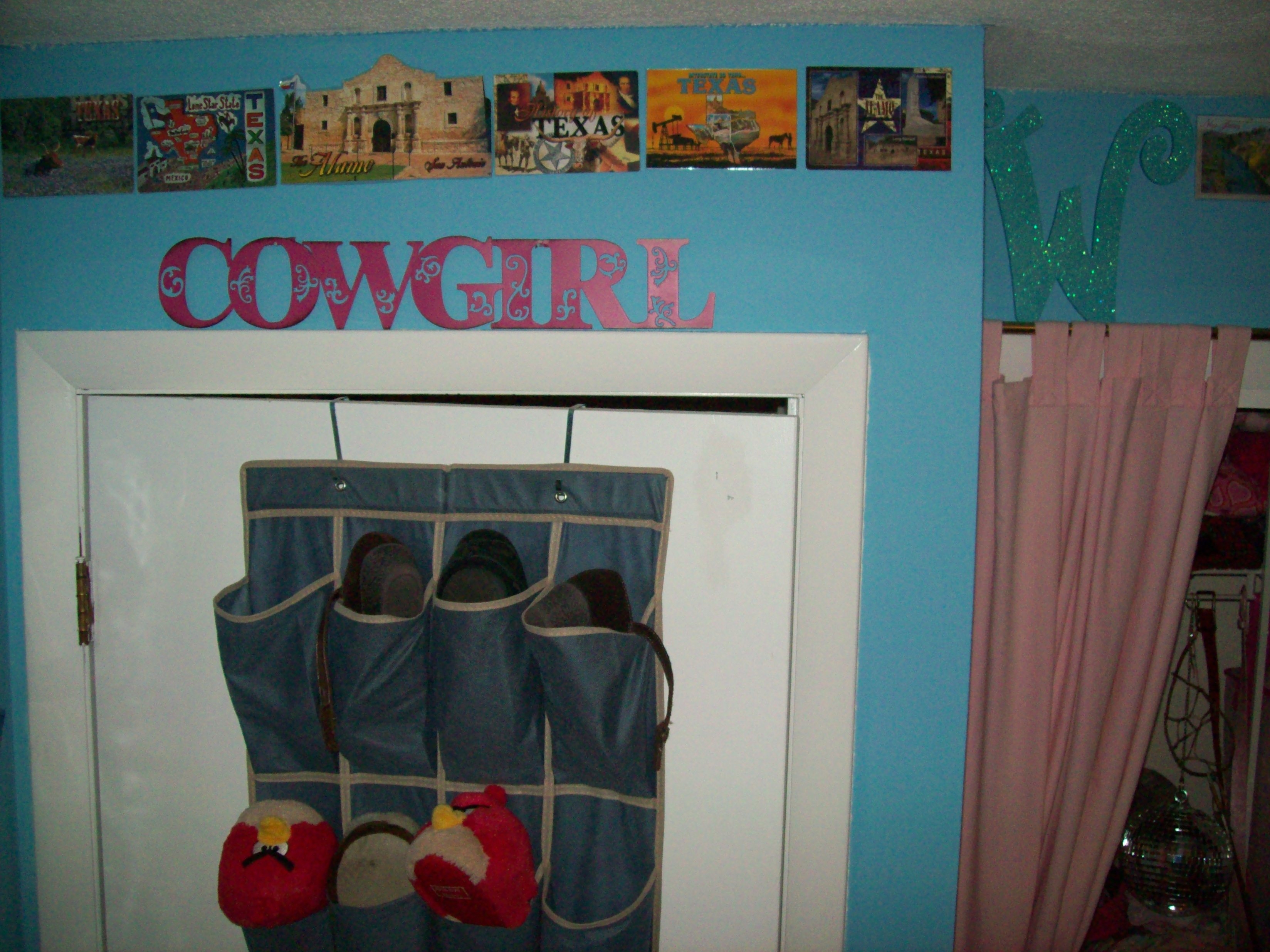 The West Wall is over the back of her door and over her closet. The wall over the door houses her Texas postcards and her Cowgirl sign.