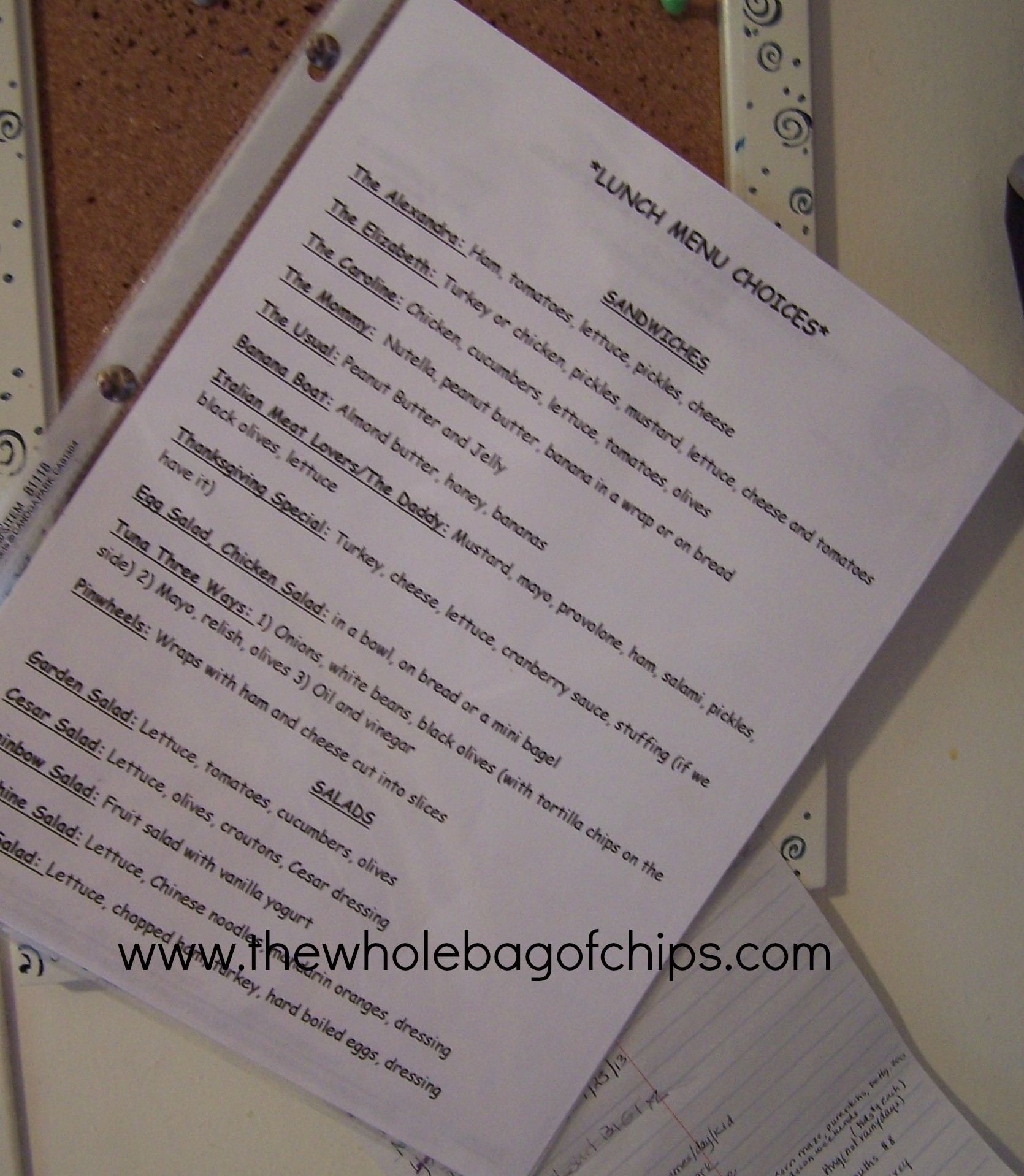I had the idea to make a list of all the things they loved to eat that I could put into a lunchbox pretty easily, so that similar to the school menu that comes home each month, they could pick and choose what they’d like for lunch from home and as long as I had the items on hand in the house, I could make them some lunches with more variety than what’s now known as “The Usual” (pb&j).