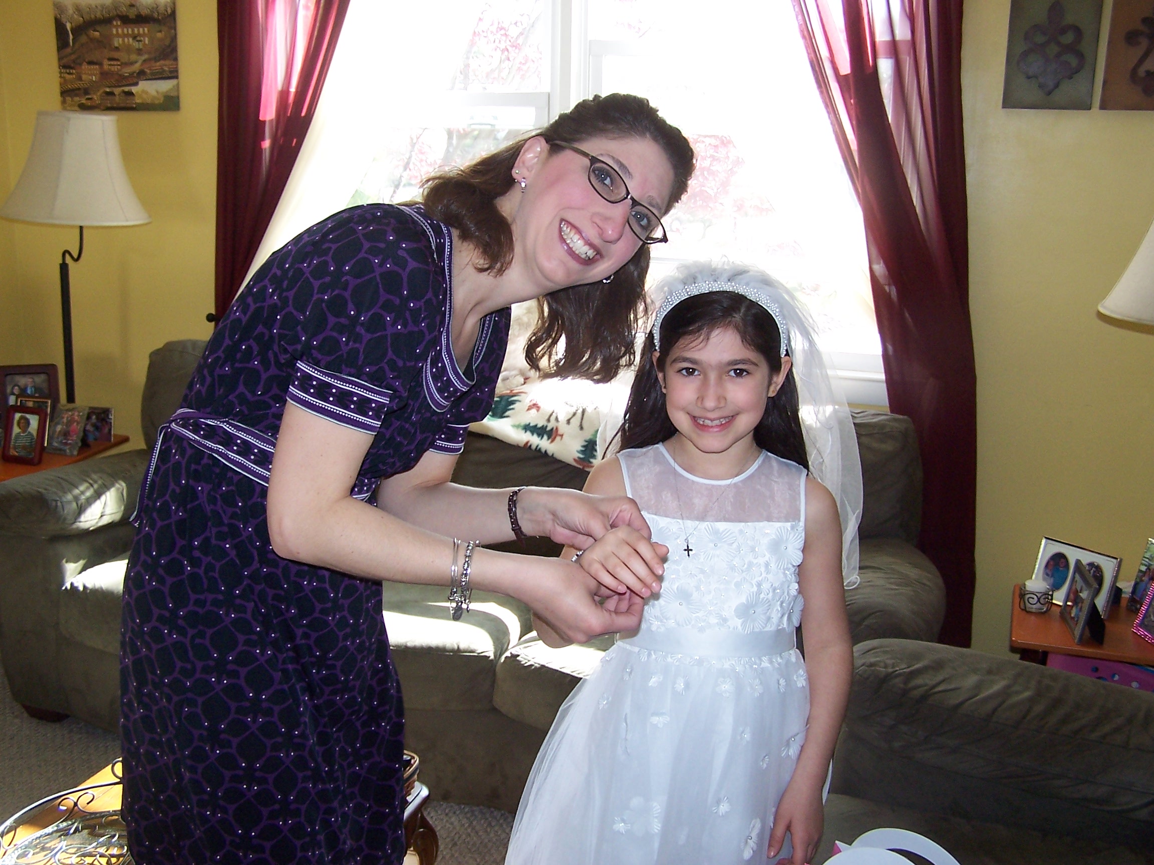 Giving Alexandra her special First Communion bracelet, a tradition we started with Caroline.
